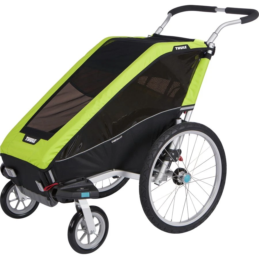 The Cheetah features a roomy main compartment that gives the kiddo space to play with their toys or look at books while you’re moving. A padded 5-point seat belt system keeps themsafe through turns and over bumps, while the adjustable suspension system lets them enjoy a smooth ride. They’ll love the tinted mesh windows when you stroll past the pond so they can watch all the ducks, and you’ll love it for the enhanced UV protection it provides. When it’s time to stop for a snack, the foot-activated parking break ensures you won’t have a runaway stroller situation on your hands. Conversion kits (sold separately) let you configure the Cheetah to your latest adventure, whether that be jogging through the suburbs, cycling down country roads, or cross country skiing through wintry landscapes.