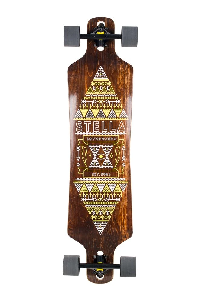 The Stella Pyramid Longboard is a Twin Drop Drop Through cruiser 39″ longboard. The board is made out of 8 plies of 100% Canadian maple. Great longboard for all types of longboarding styles like cruising and carving. Excellent quality longboard with Ghost wheels, such a sweet longboard.